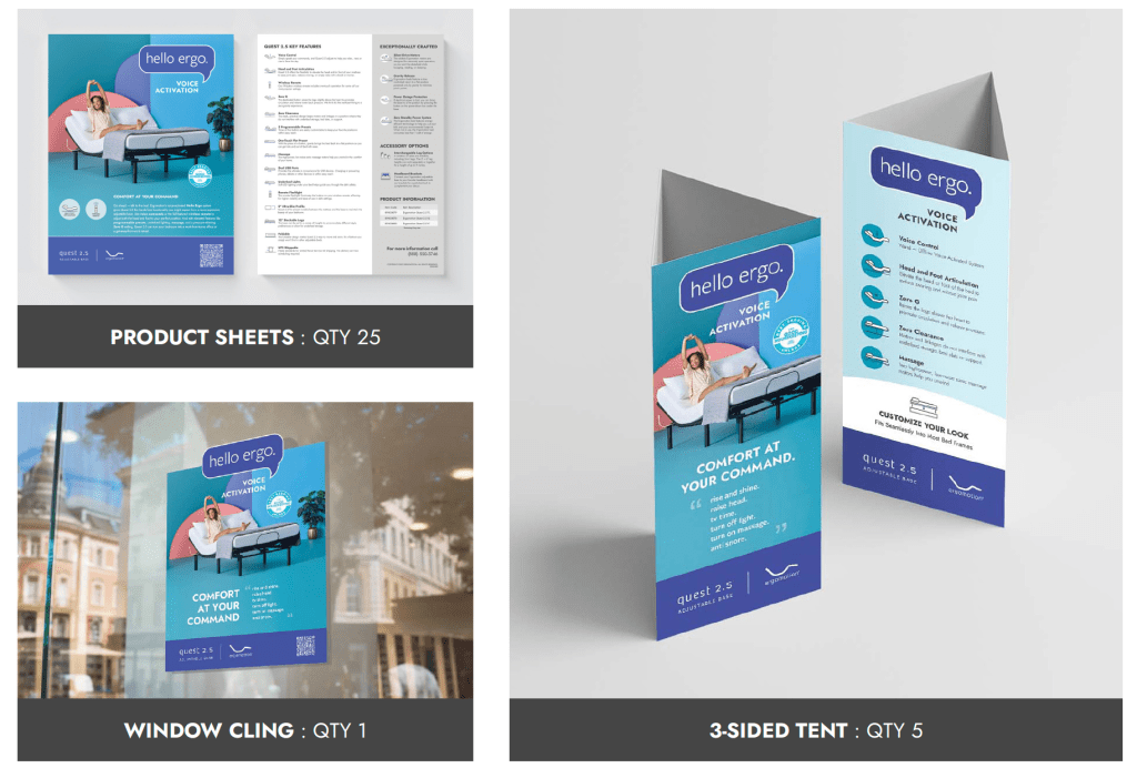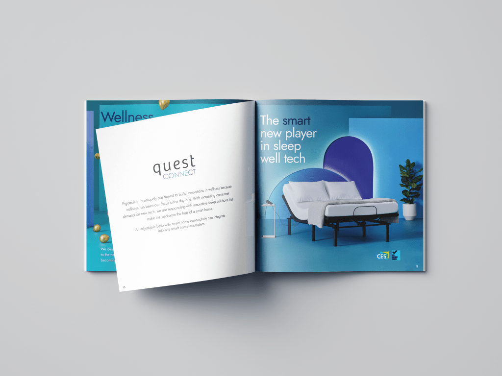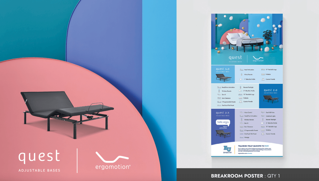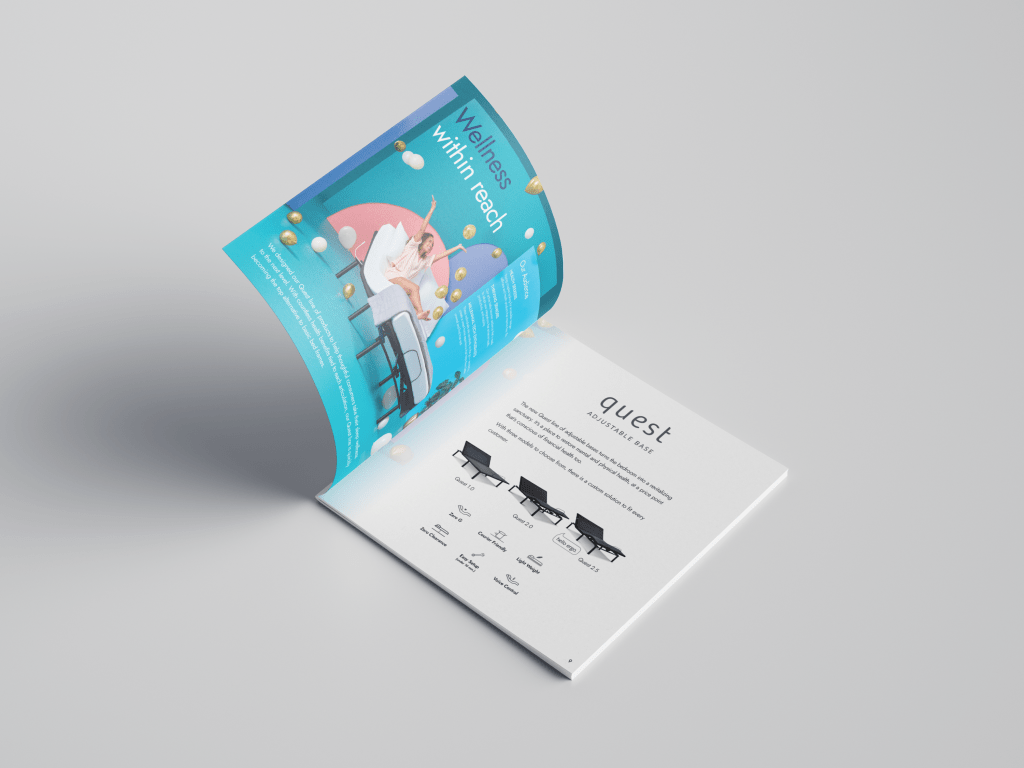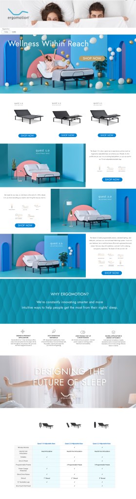 Developed and Art Directed Product and Lifestyle photoshoot. Pushing the boundaries of typical industry expectations to create a bedroom scene, I developed a color blocking concept that suggested a living space and grew as the products progressed from less features to the most. A separate set was then developed to indicate the addition of Smart Home technology features and an App to control the base and these new features.
